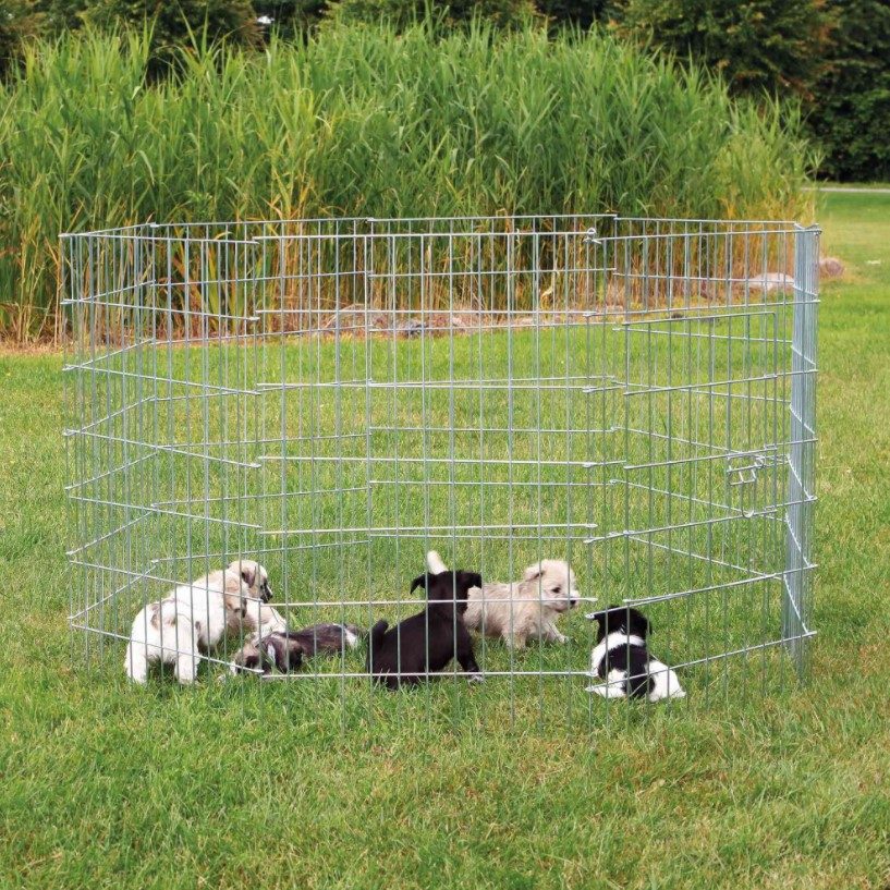 Denne praktiske valpegrinden / valpegården gir valpene mulighet til å få et trygt første møte med livet utendørs. Valpegrinden / valpegården har dør for å gjøre det enkelt å gå ut og inn. Materiale: galvanisert metall. 8 elementer á 61 x 91 cm.