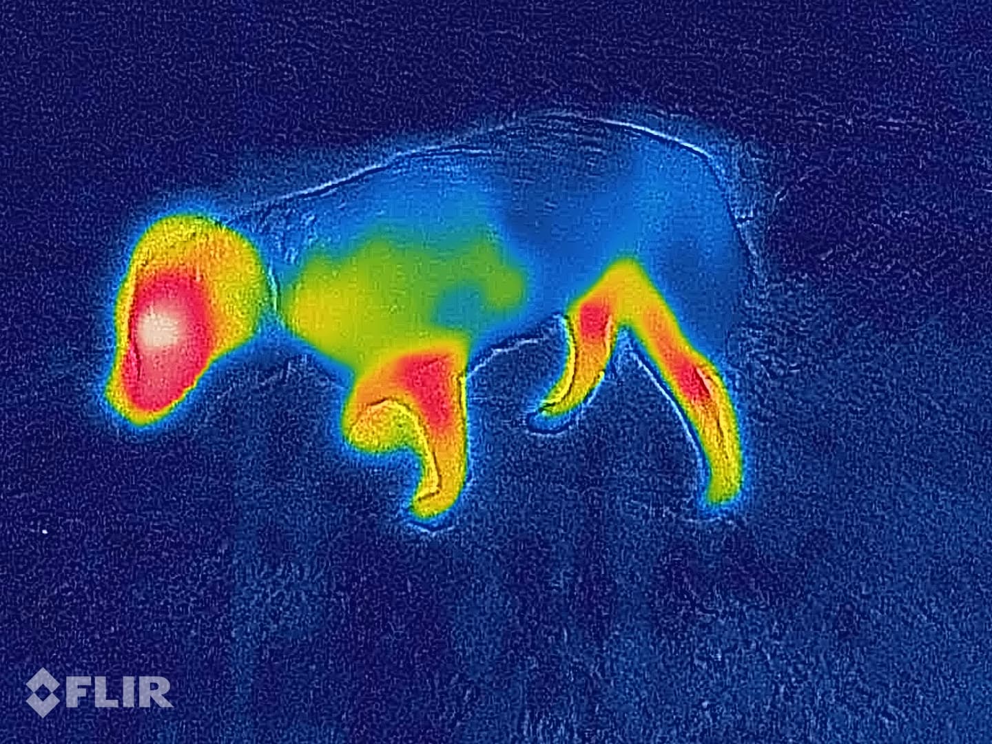 Bildet under er en hund med AMBASSADØR ulldekken på, det er tatt med FLIR termografikamera. (Det viser – beviser – at hunden ikke har varmetap der den har dekken på seg.)