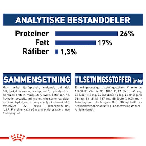 Ingredienser: Tørket fjørfeproteiner, mais, maismel, animalsk fett, hvete, ris, maisgluten, hydrolysat av animalske proteiner, betefiber, fiskeolje, soyaolje, mineralsalter, gjær, hydrolysat av krepsdyr (glukosaminkilde), hydrolysat av brusk (kondroitinkilde).