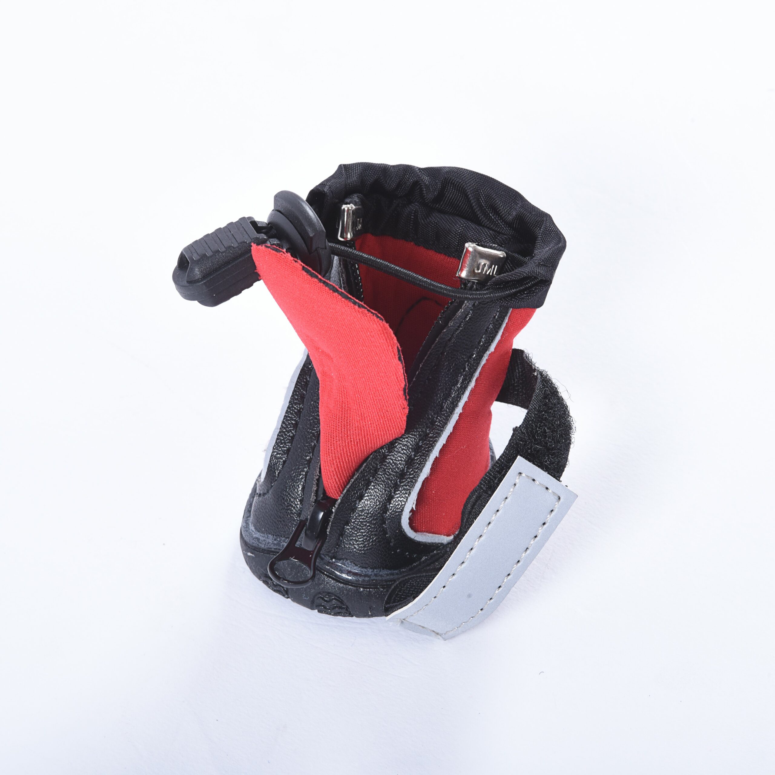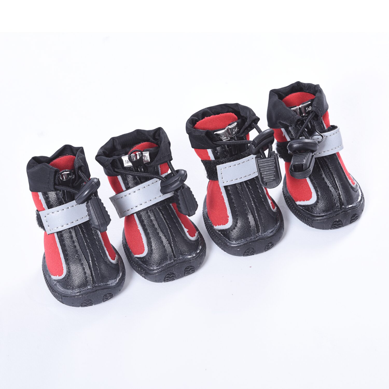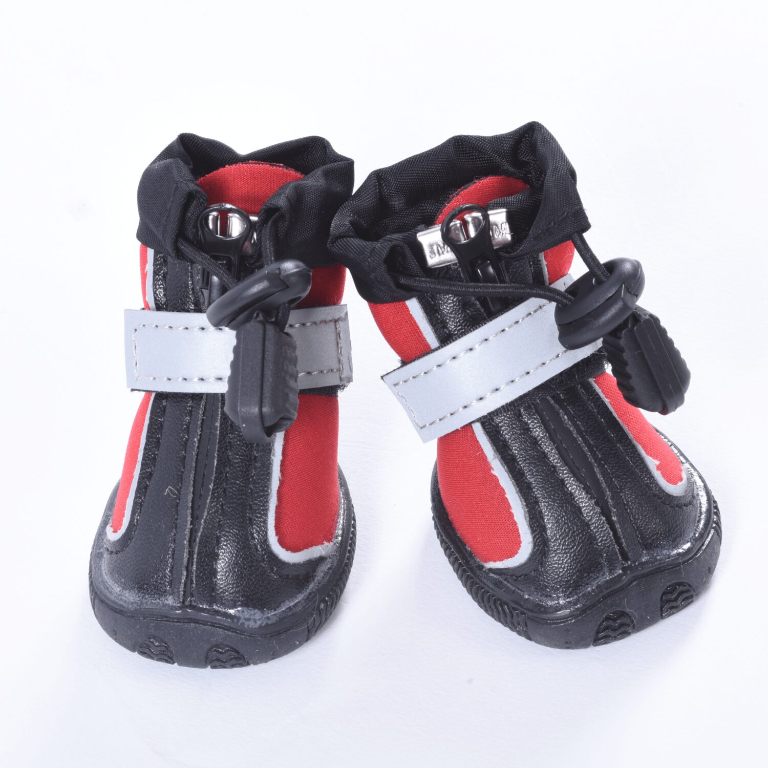 “Vanntette tur- og joggesko til hund – 4 sko i pakken med sklisikker gummibunn. Lett å ta på, sitter godt på foten og har refleksstriper for ekstra sikkerhet på tur.”
