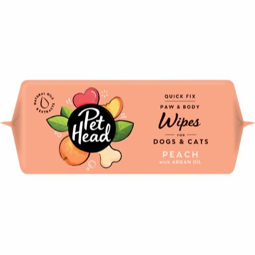 Pet Head Quick Fix Cleaning Wipes Paw & Body er praktiske våtservietter som er egnet både til katt og hund. Våtserviettene kan brukes til å vaske kjapt over kropp, ansikt og poter, og etterlater pelsen myk og velduftende. Spesielt praktiske til sølete poter! Inneholder arganolje, jojobaolje, kokosnøttolje og Aloe Vera som er pleiende og milde mot huden. Våtserviettene er biologisk nedbrytbare. Pet Head er cruelty free. 80 pk