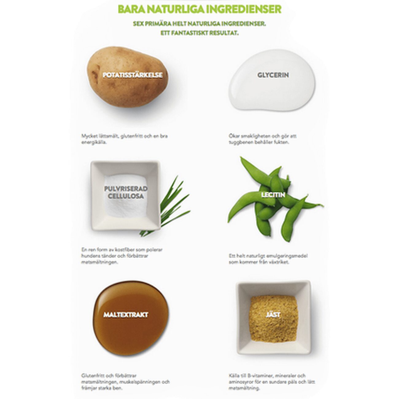 • Cellulosepulver – Hjelper til med å rense hundens tenner og hjelper fordøyelsessystemet.