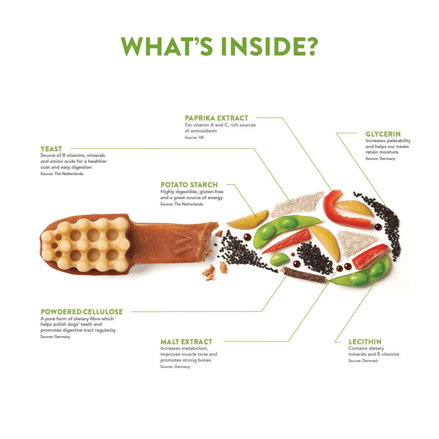 Whimzees har 6 naturlige, funksjonelle ingredienser og ingen kunstige tilsetninger, farger, smaksstoffer, konserveringsmiddel, GMO, gluten eller kjøtt. Dessuten har de et høyt fiberinnhold og et lavt innhold av kalorier og sukker. Råvarene i Whimzees er godkjente for menneskelig bruk.