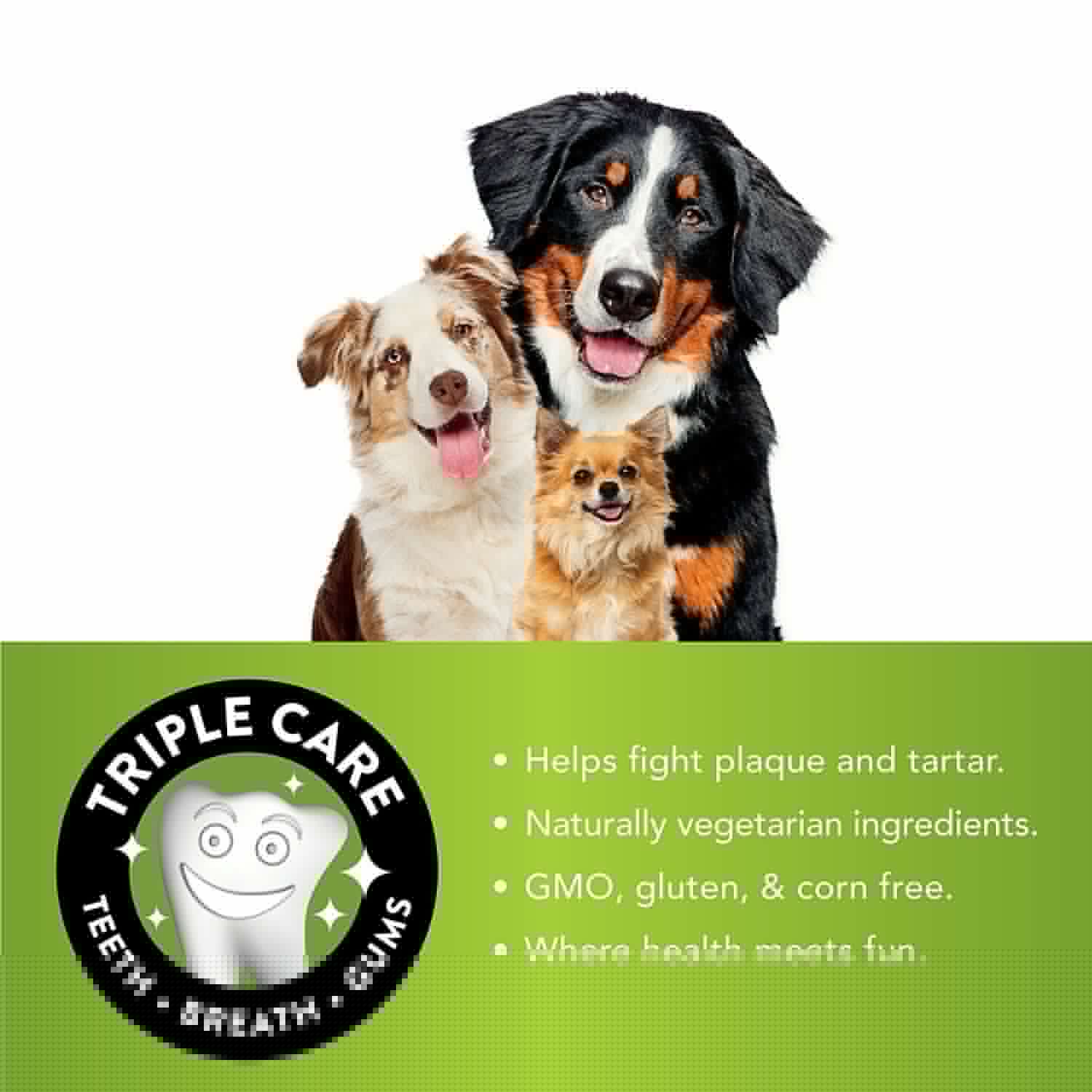 • Vegetariske, glutenfrie hundetygg som motvirker forekomsten av plakk