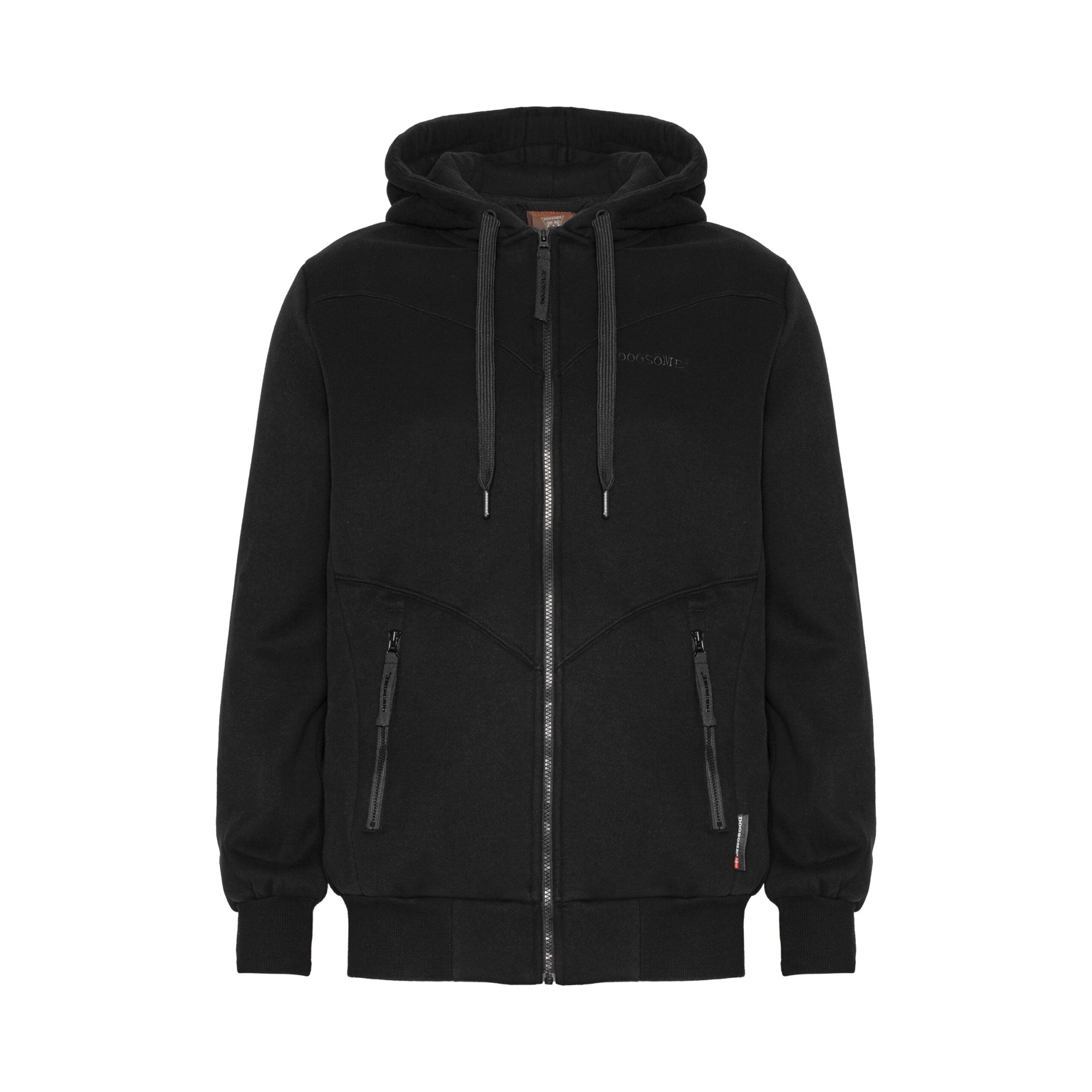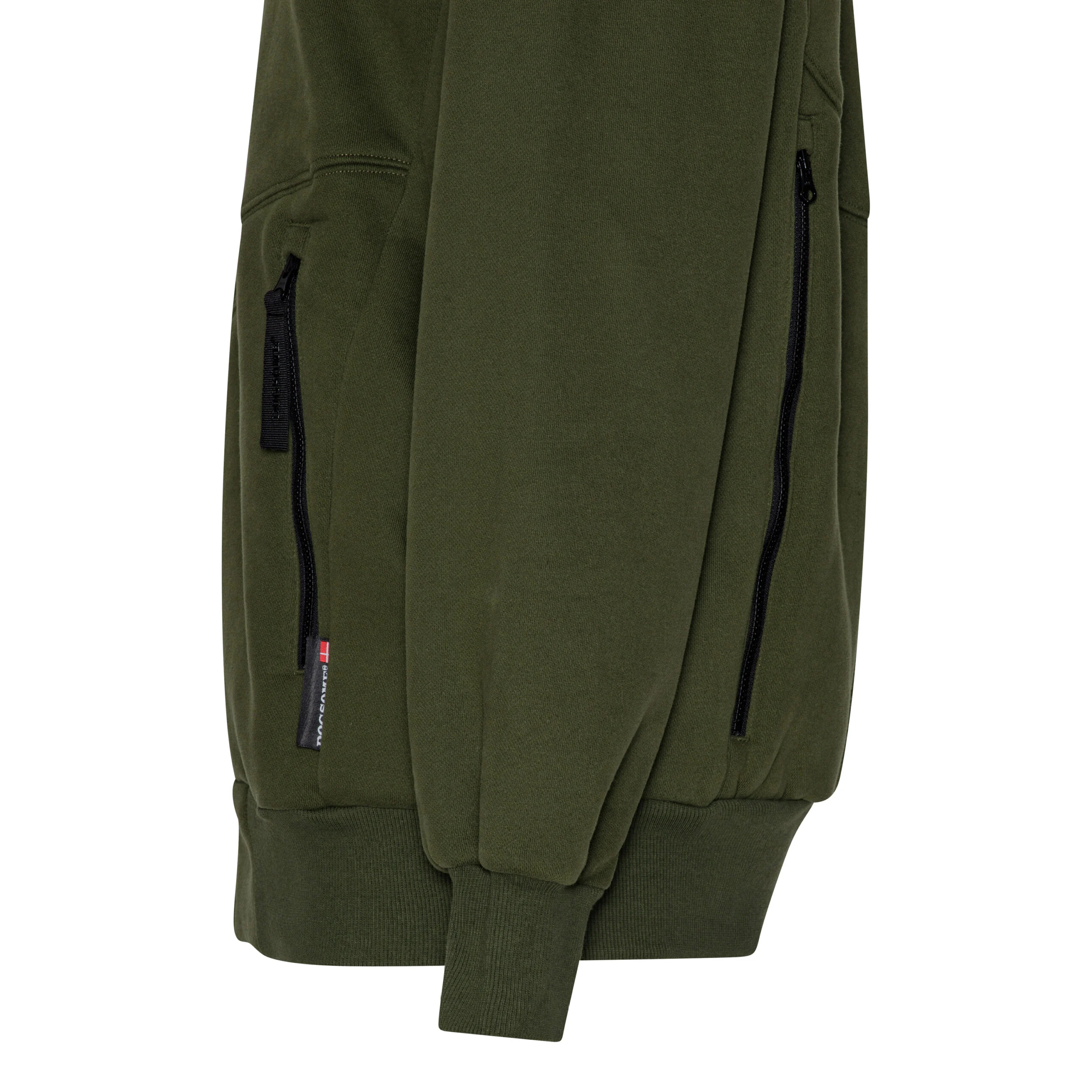 Den har justerbar hette, ribbestrikkede mansjetter og midje, og en praktisk glidelås foran. Den har store frontlommer med glidelås og en stor gjennomgående baklomme.
