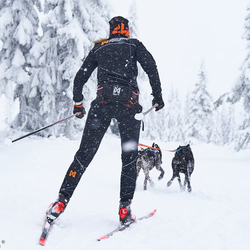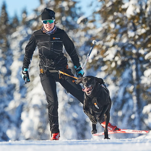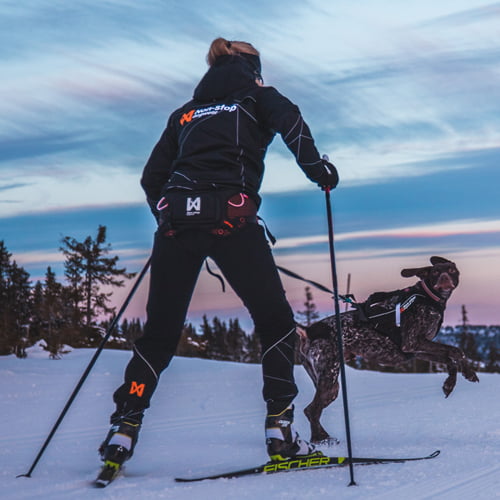 Innovativt trekkbelte spesielt utviklet for å gå på ski med hund. Beltet er laget i teknisk materiale og har en utforming som legger til rette for optimal skiteknikk.