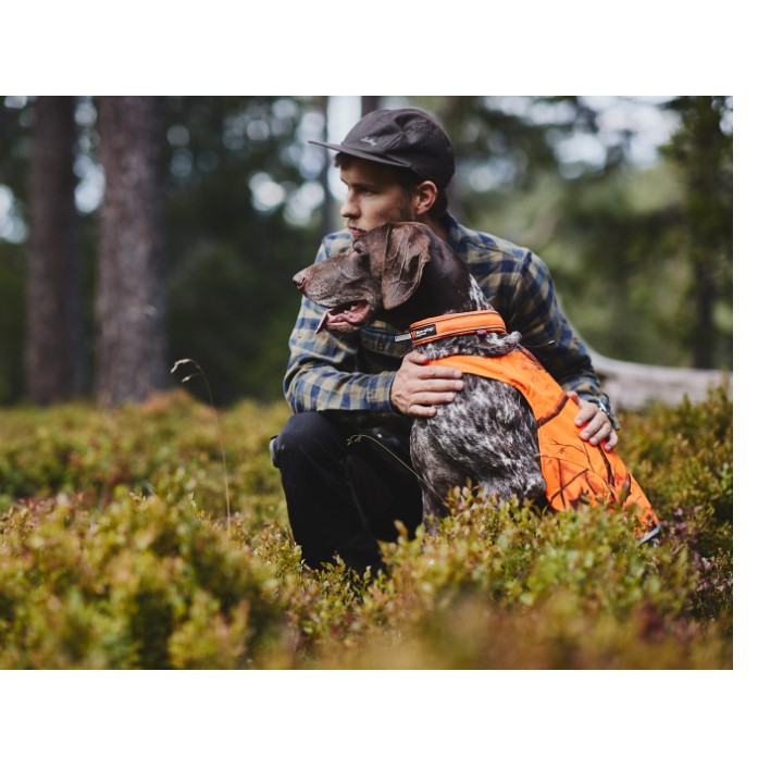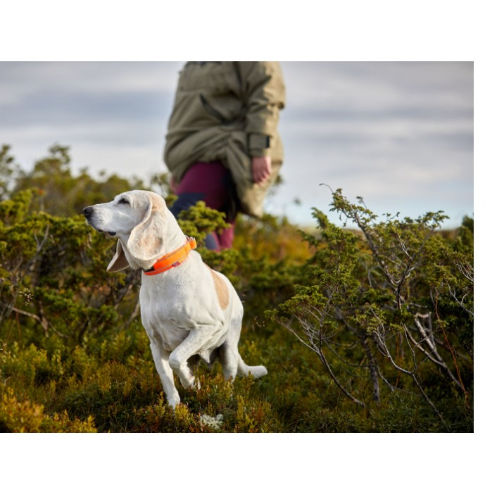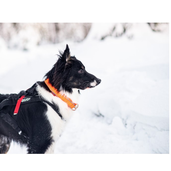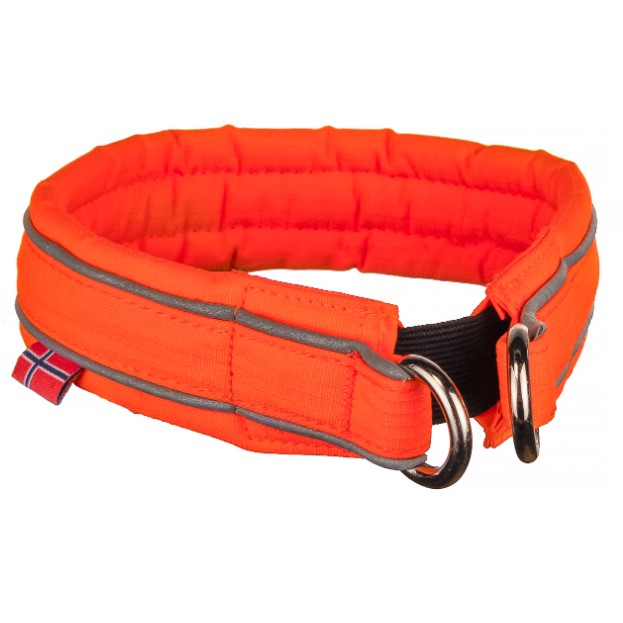 Det sikreste halsbåndet for hunder som løper mye løs i skog og utmark. Non-Stop Dogwear har utviklet Safe Collar for hunder som går mye løs i skogen. Det unike designet med strikkelement gjør at hunden lettere kommer seg løs om den skulle hekte seg fast. Du mister kanskje halsbåndet, men ikke hunden! Sterk farge og to striper med 3M refleks rundt hele halsbåndet øker synligheten betraktelig på avstand. Halsbåndet har godt synlig navnelapp i gummi. Kobbelet festes i de to D-ringene, da fungerer Safe collar som et vanlig statisk hundehalsbånd.