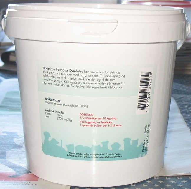 Blodpulver fra Norsk Dyrehelse er enkelt å dosere og kan tilpasses ulike behov. Som næringstilskudd i aktive perioder eller som smakstilsetning, anbefales 1/2 – 2 ss tørt pulver, eller samme mengde utblandet med 2-5 dl vann. Ved legging av blodspor, blandes 1 ss pulver med 1-2 dl vann. En boks inneholder 800 g, noe som gir mange anvendelsesmuligheter.