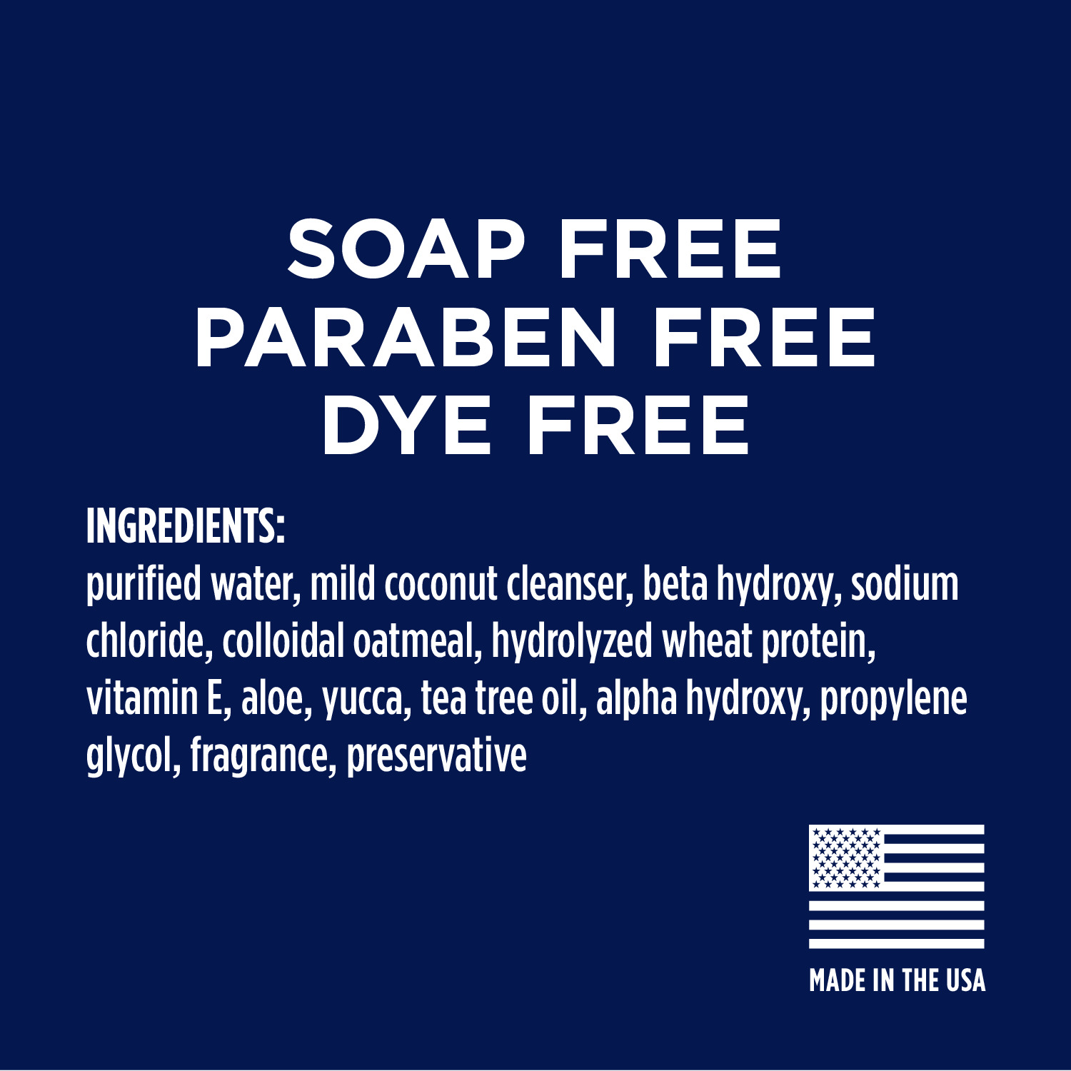 Renset vann, mildt kokosnøttvaskemiddel, betahydroksy, natriumklorid, kolloidalt havregryn, hydrolysert hveteprotein, vitamin E, aloe, yucca, tea tree olje, alfahydroksy, propylenglykol, duft, konserveringsmiddel.